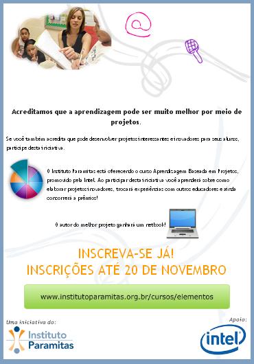 A Intel está lançando uma nova série de cursos na web para auxiliar professores a desenvolver melhor a aprendizagem dos seus alunos com o auxílio de projetos tecnologias. O primeiro curso desta série de cursos é o “Aprendizagem Baseada em Projetos”. O curso tem carga horária de 40hs para os educadores que realizarem o curso e elaborarem o Plano de Ação proposto, que precisa ser publicado ao final do curso.